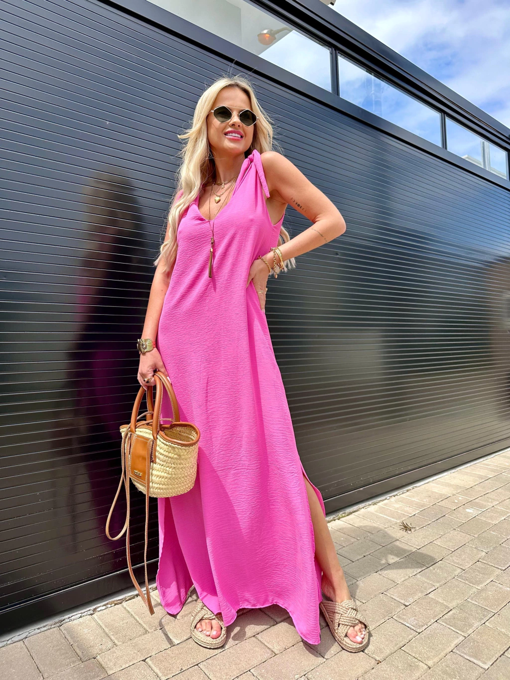 O vestido Amalfi, é feito em crepe importado, e graças à sua composição 100% poliéster, uma vez passado, ele não amassa mais.